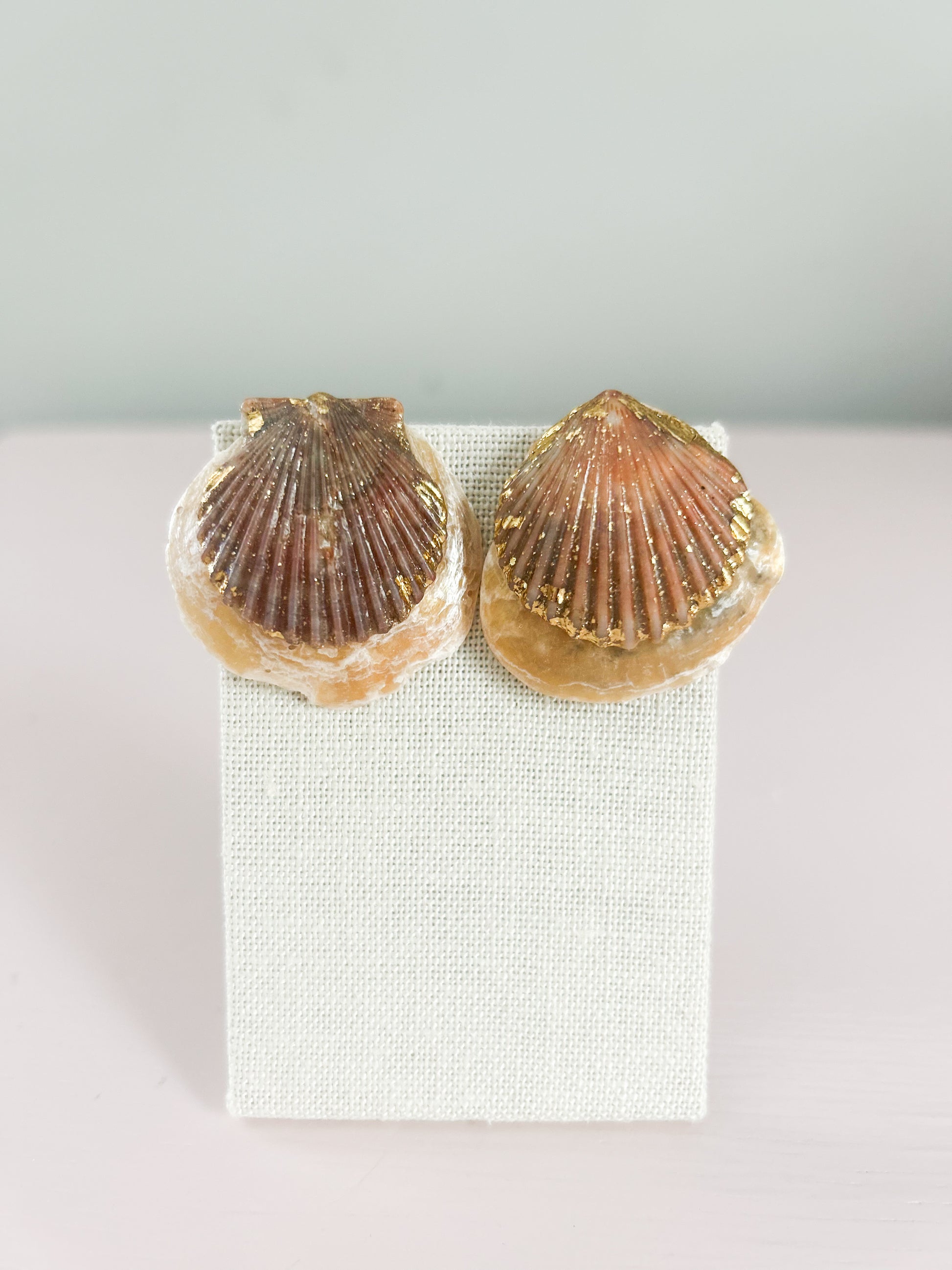 Expertly crafted with real scallop and jingle shells, our Brown All Too Well Studs are a stunning addition to any wardrobe. The brown and tan shells are stacked in a unique design and accented with delicate gold leaf details. With a pierced clip back, these studs are both stylish and practical, preventing sagging and ensuring a comfortable fit. Elevate your style with these one-of-a-kind earrings.