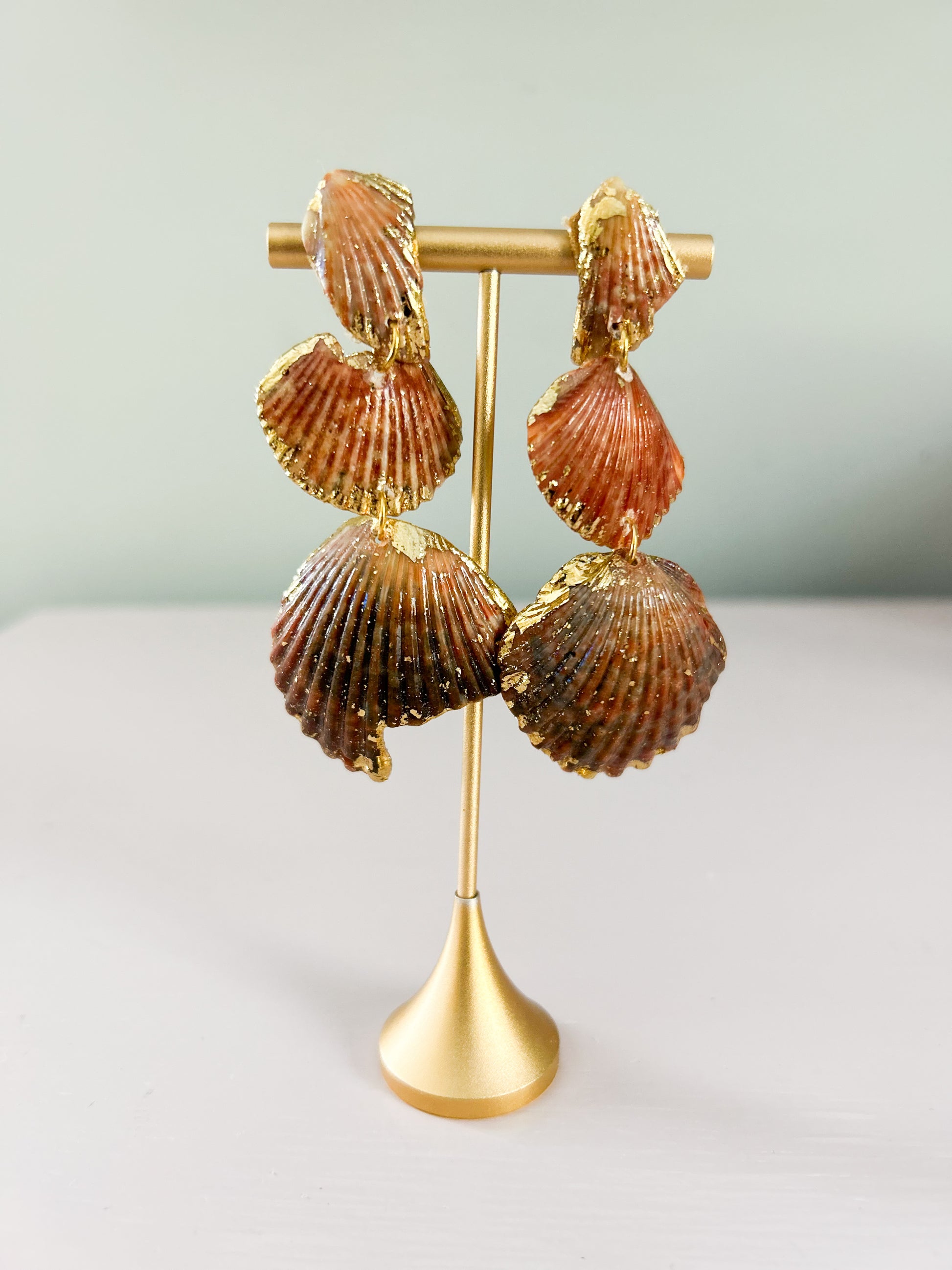 The Brown Love Story Earrings feature large natural brown scallop shell pieces accented with delicate gold, creating a refined and organic aesthetic. Designed with hypoallergenic post backs, they ensure comfort for sensitive skin. Their lightweight construction makes these earrings perfect for all-day wear, combining elegance with practicality for a versatile accessory.
