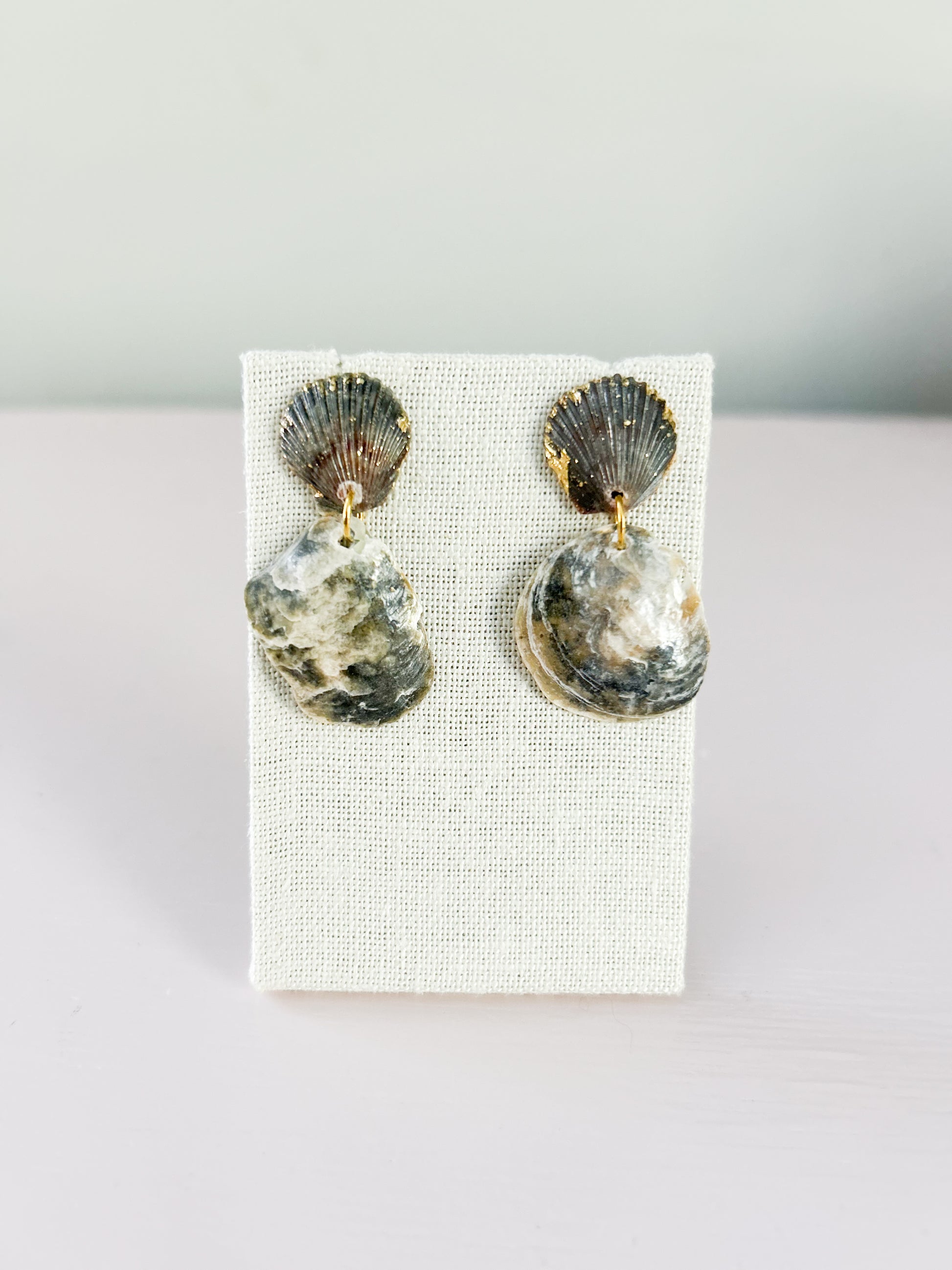 The Grey All Too Well Invisible String Dangle features elegant grey scallop shells complemented by grey and white jingle shells, accented with subtle gold details. Designed for comfort, these lightweight earrings include hypoallergenic post backs, making them suitable for sensitive skin. Their delicate combination of natural tones and refined accents creates a sophisticated accessory perfect for any occasion.