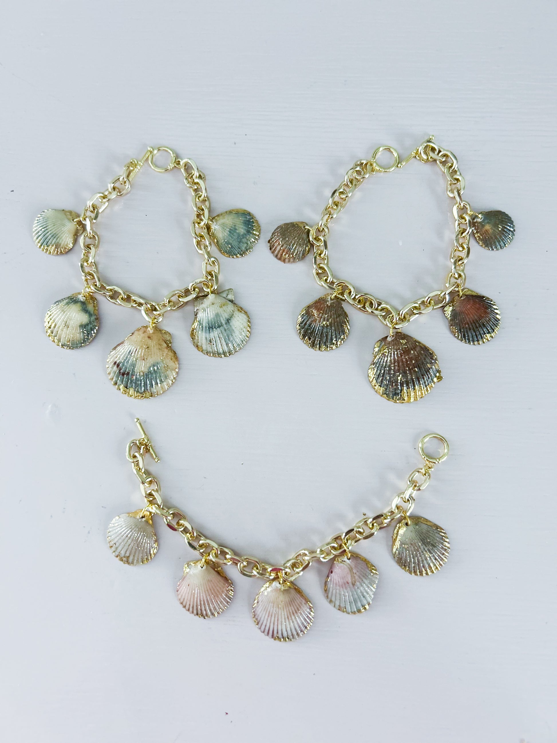 Crafted with authentic shells, this Multi Shell Charm Bracelet features five complimentary scallop shells in varying sizes, each enhanced with delicate gold leaf accents. Secured by a sturdy toggle clasp, it offers both elegance and durability. Perfect for those who appreciate natural beauty combined with refined craftsmanship.