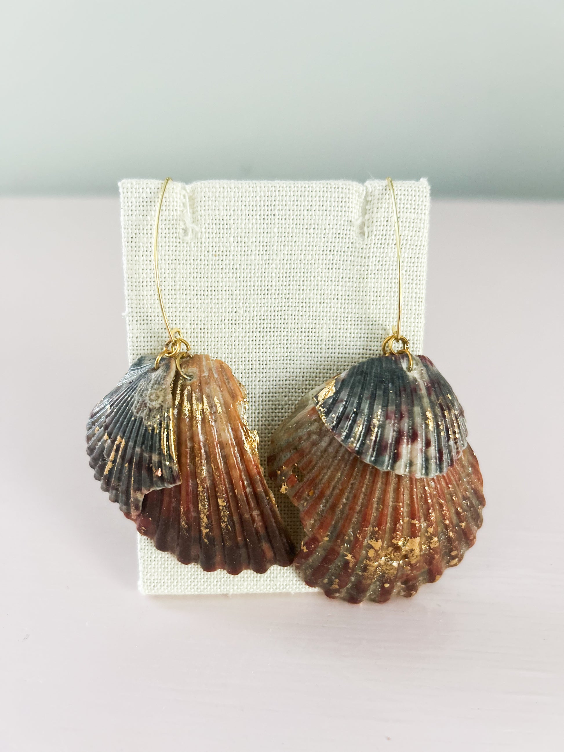These Orange and Grey Exile Hook Earrings are a perfect fashion statement, combining the stylish hook design with unique orange and grey scallop shell pieces. The stacked style adds dimension, while the gold leaf accents provide a touch of elegance. Elevate your look with these one-of-a-kind earrings.