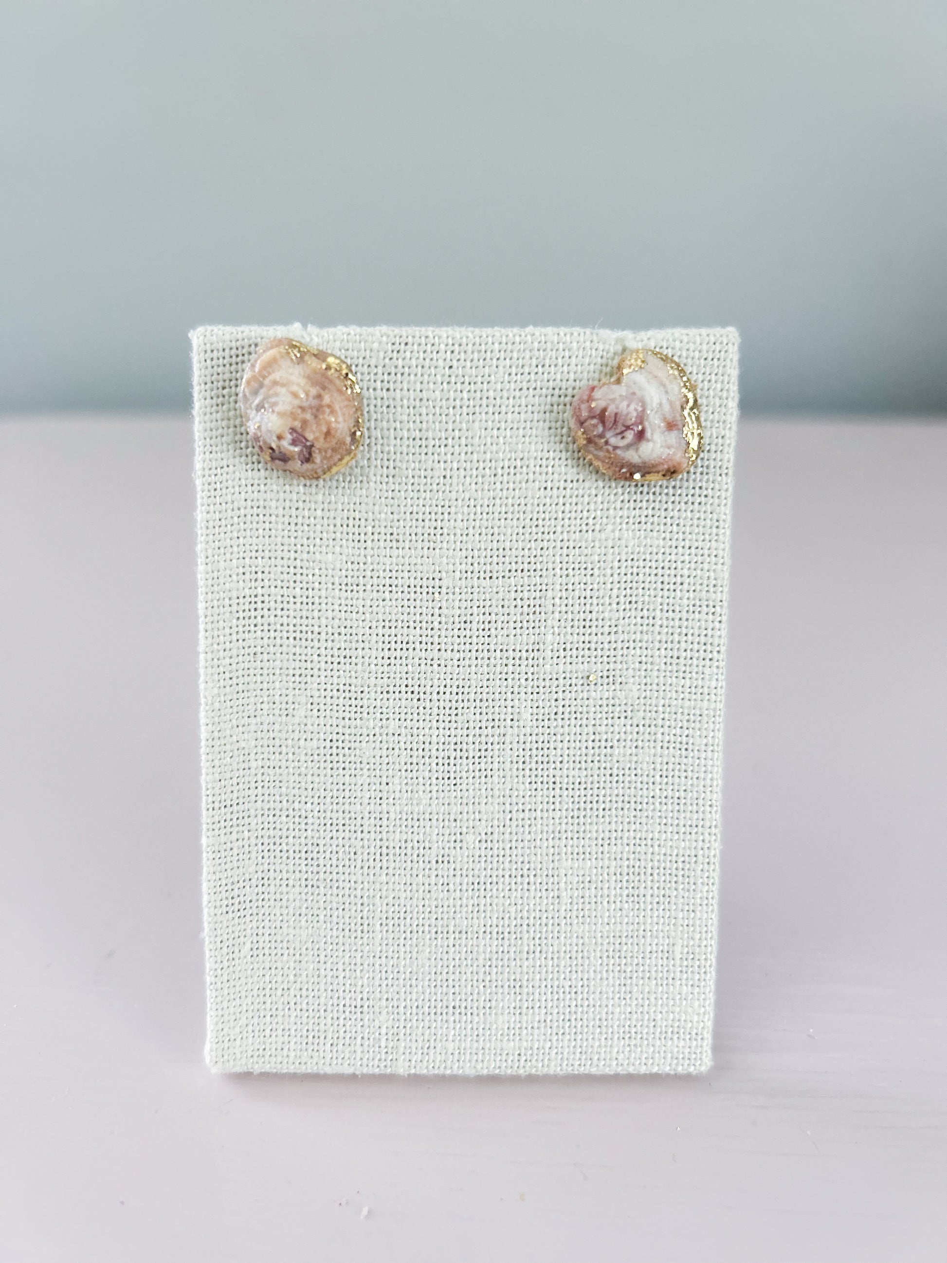 These Oyster Shell Stud Earrings feature delicate small pink and white oyster shells accented with subtle gold details. Designed with hypoallergenic post backs, they ensure comfort and safety for sensitive ears. A soft leather pad enhances wearability, making these earrings both elegant and practical for everyday use.
