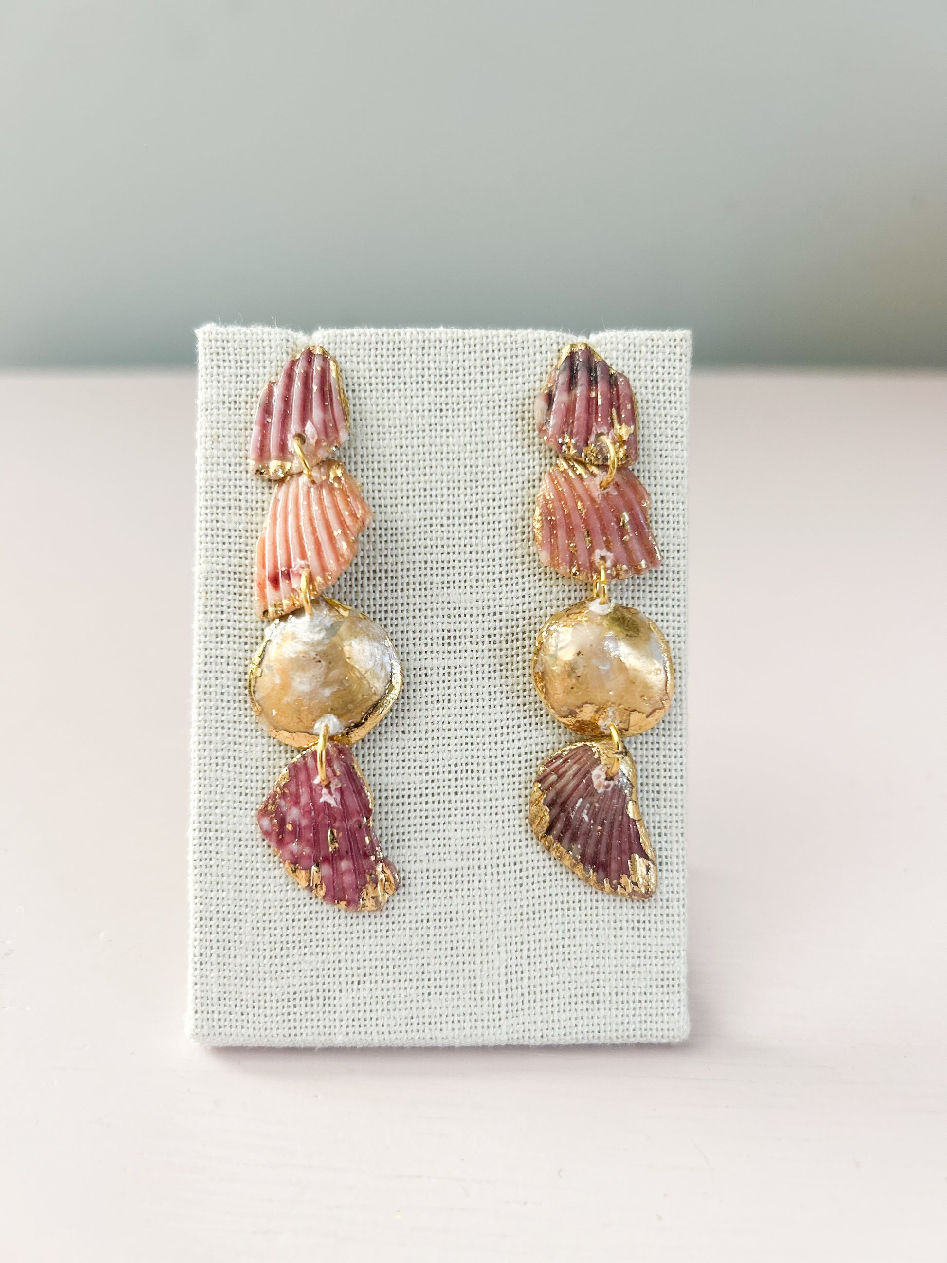 These delicate dangle earrings feature pink and orange scallop shells, along with gold jingle shells, for a stunning tiered effect. The lightweight design and hypoallergenic post back make them comfortable to wear all day. Expertly crafted with a tiered style, these earrings are a must-have for any fashion-forward individual.