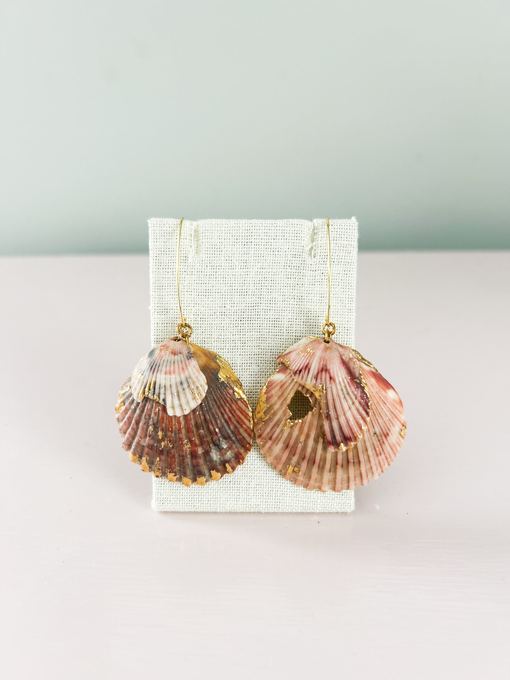 Introducing the Pink and Orange Exile Hook Earrings. These beautiful earrings feature a pink and orange scallop shell design with delicate gold leaf accents, all attached to a stylish hook for easy wear. Elevate any outfit with these unique and elegant earrings.