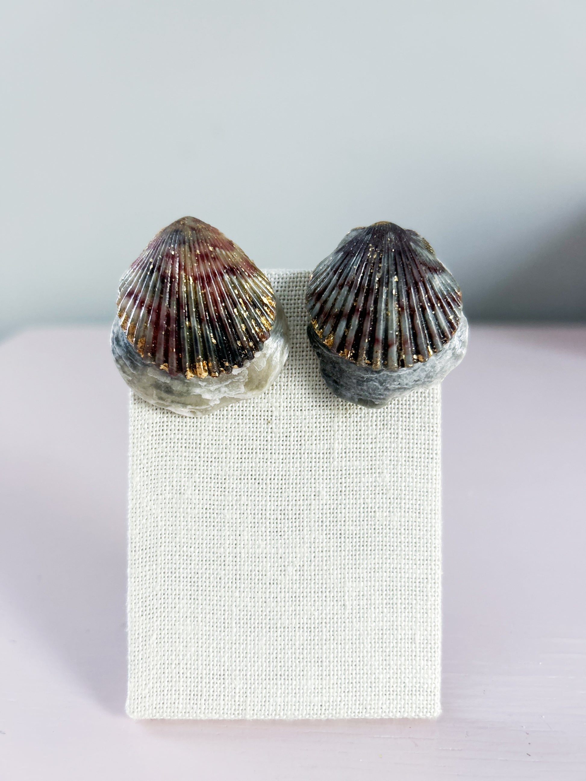 These Purple All Too Well Stud Earrings feature delicate purple scallop shells elegantly stacked atop grey jingle shells, creating a unique layered design. Crafted with hypoallergenic post backs and secure clips, they ensure comfortable wear without sagging. Lightweight and accented with subtle gold details, these earrings combine style and practicality for everyday elegance.