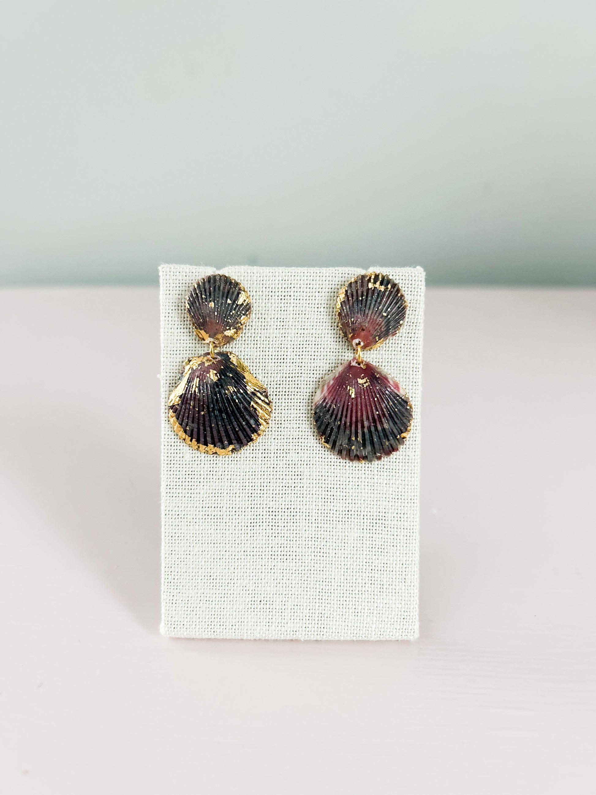 Expertly crafted scallop shell dangle earrings featuring a stunning combination of purple and blue hues. These earrings are designed for comfort with a post back and leather circle, and are elevated with gold leaf accents. Elevate any outfit with these small invisible string earrings.
