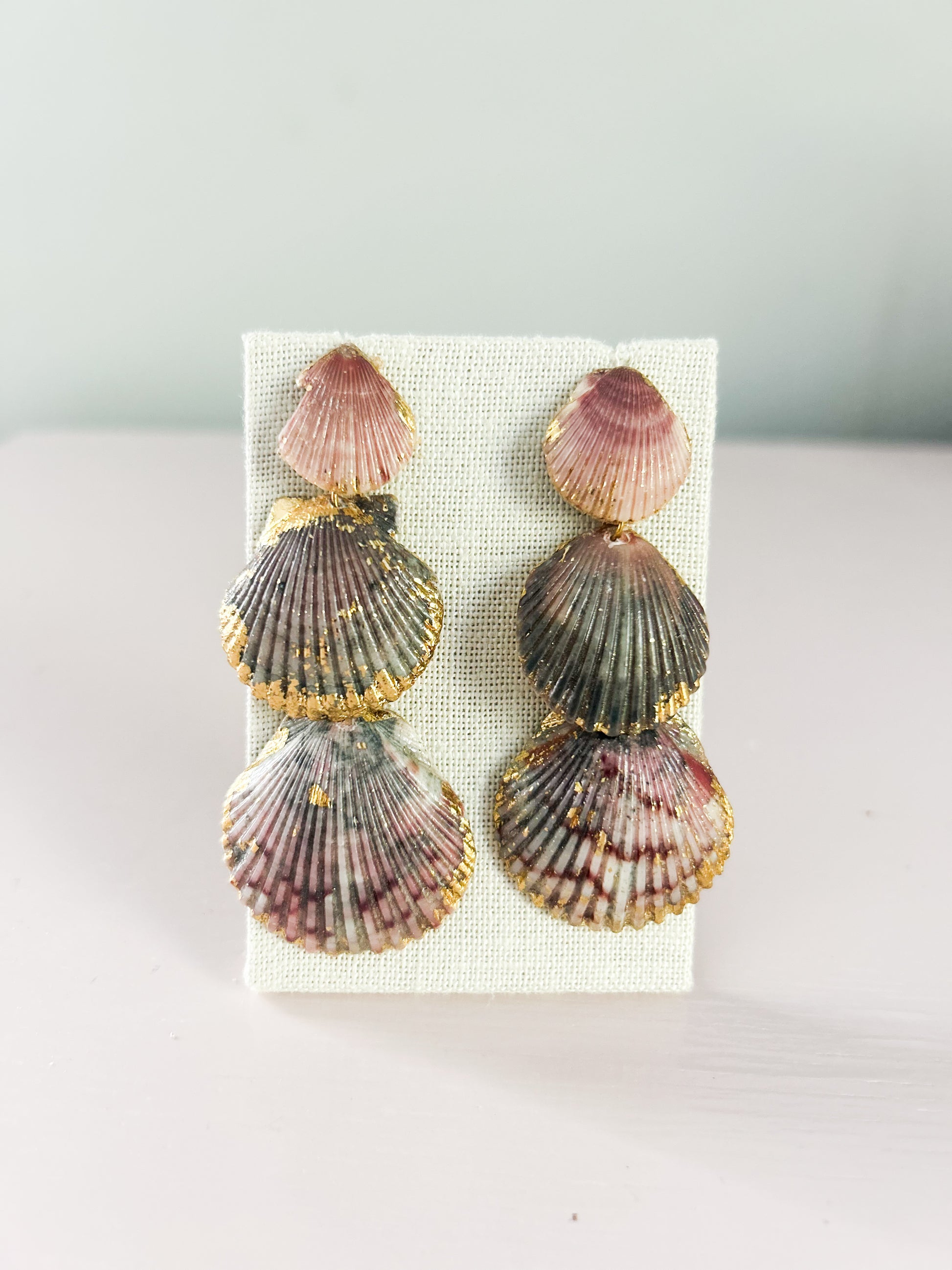 These Purple and Grey Marble Gorgeous Earrings feature a tiered design with marbled scallop shells accented by subtle gold details. Crafted for comfort, they include hypoallergenic post backs and are lightweight, making them ideal for sensitive ears and all-day wear. Their elegant blend of soft pink and grey tones adds a refined touch to any outfit.