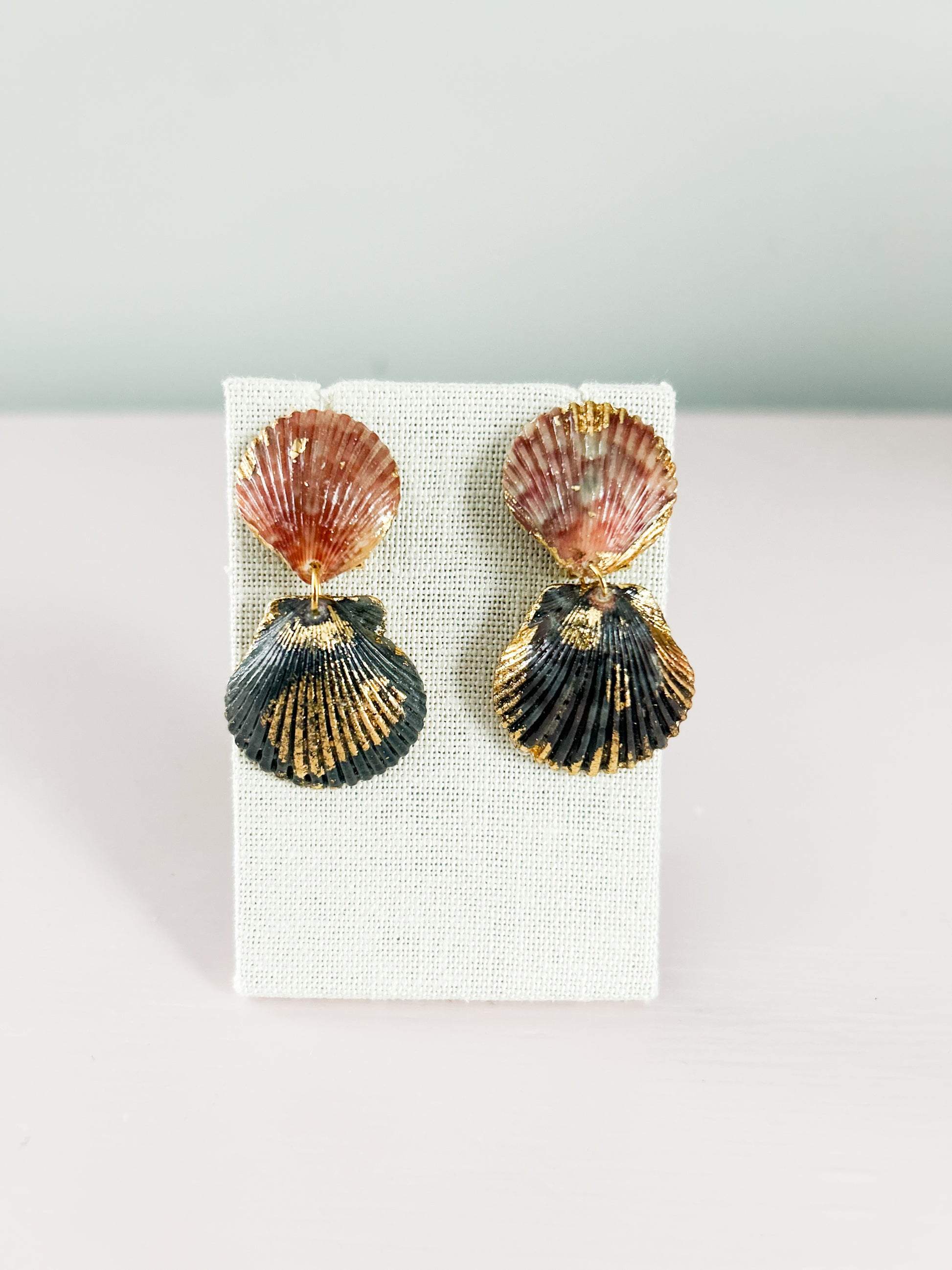 These Red and Black Invisible String Earrings feature delicately crafted scallop shells, accented with a touch of gold leaf. The unique design adds a touch of elegance to any outfit while the lightweight construction and leather circle provide added comfort. French clip pierced stud backs ensure a secure and comfortable fit.