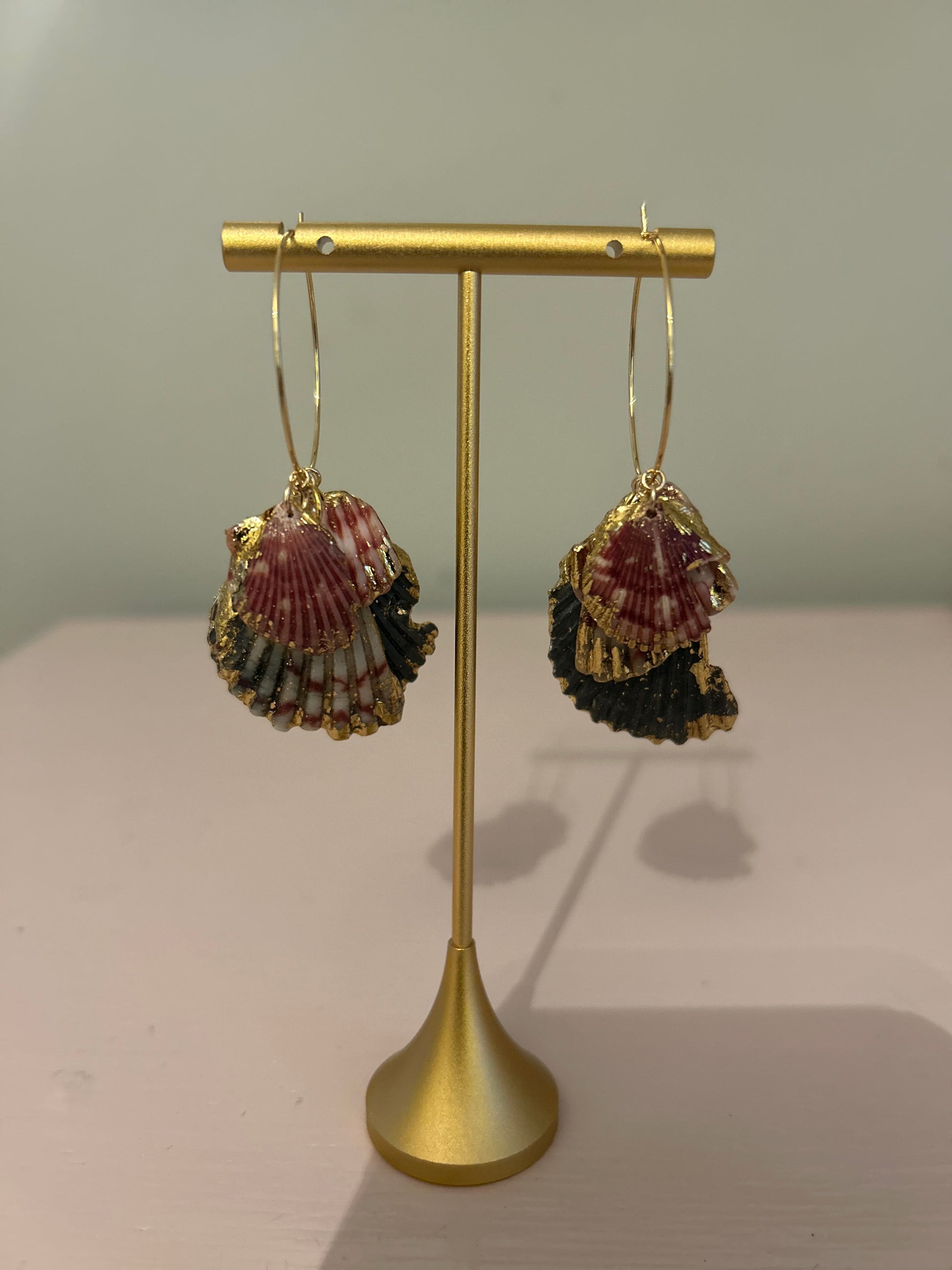 These Red, White, and Blue Exile Hoops feature a striking combination of red and white scallop shell pieces paired with blue-grey scallop shell accents. Crafted for comfort, they are lightweight and set on hypoallergenic gold-filled hoops, making them ideal for sensitive skin. This expertly designed accessory offers a unique blend of natural beauty and durability, perfect for adding a refined touch to your look.