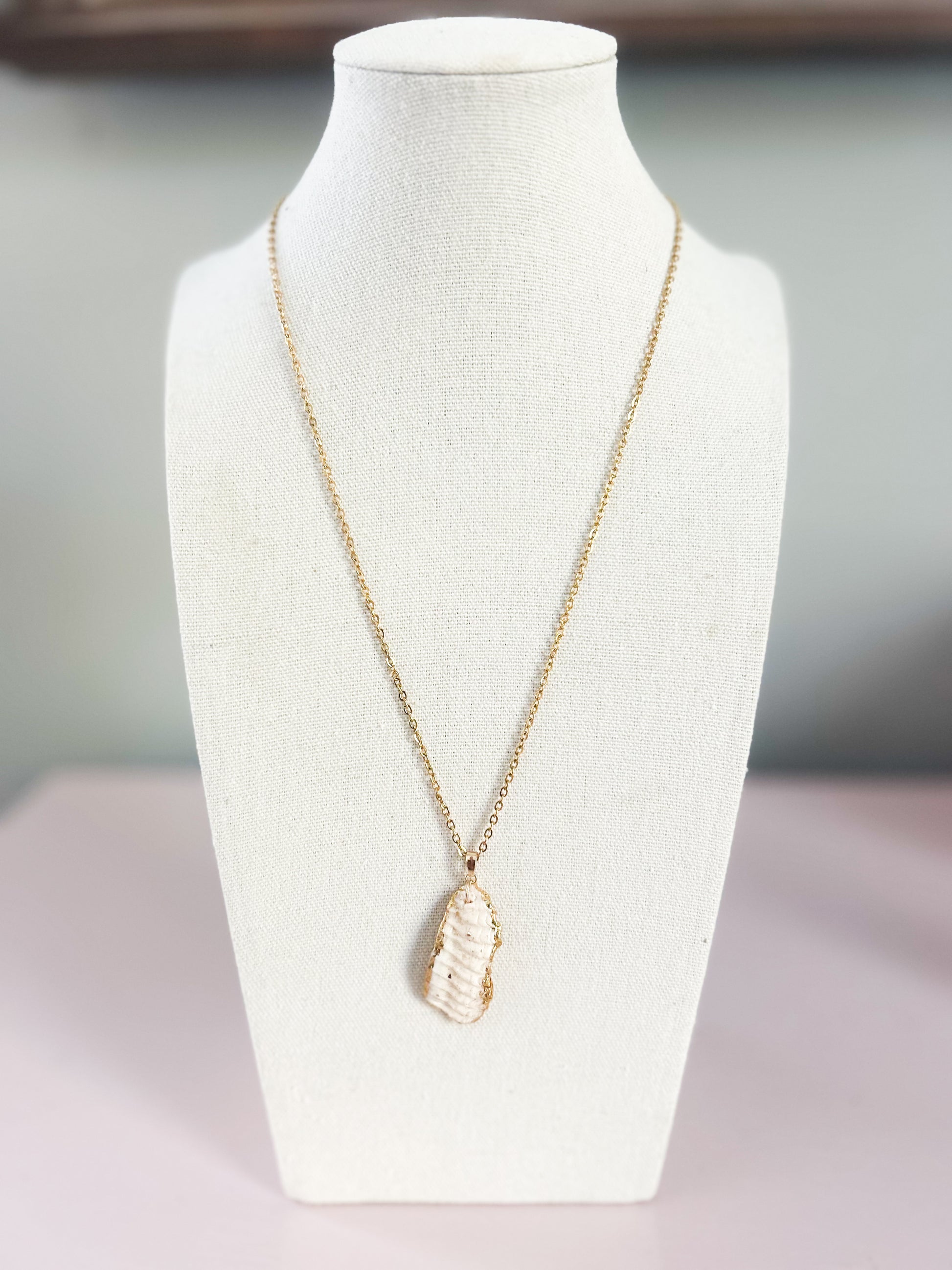 Elevate your jewelry collection with this Shell Piece Necklace featuring a delicate white fan-shaped shell pendant accented with subtle gold detailing. Suspended from a dainty, tarnish-proof chain, it ensures lasting shine and durability. The secure lobster clasp provides ease of wear while maintaining elegance. This refined piece blends natural beauty with expert craftsmanship, perfect for adding a sophisticated touch to any outfit.