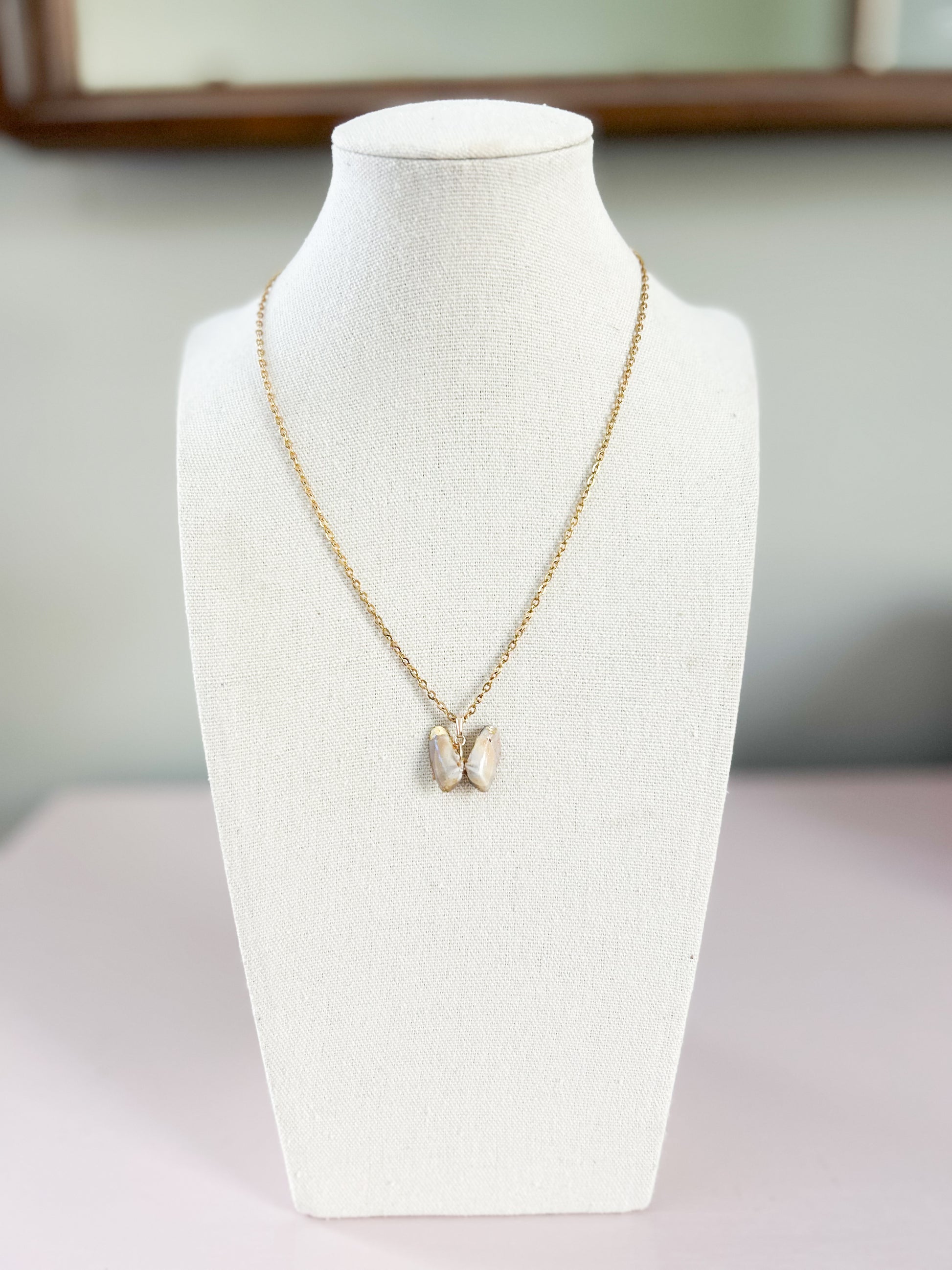 The Clam Digger Butterfly Necklace features a delicately open clam digger shell that resembles a graceful butterfly, enhanced with elegant gold accents. Suspended from a tarnish-proof gold-filled chain, this piece offers lasting shine and durability. Expertly crafted to combine natural beauty with refined metalwork, it provides a unique accessory that elevates any outfit with subtle sophistication.